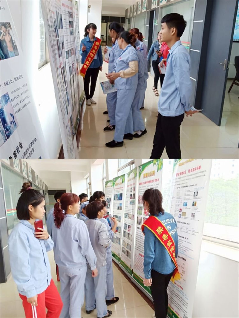 禁毒志愿者組織企業(yè)職工觀看禁毒宣傳展板并引導職工學習禁毒展板上的毒品預防措施