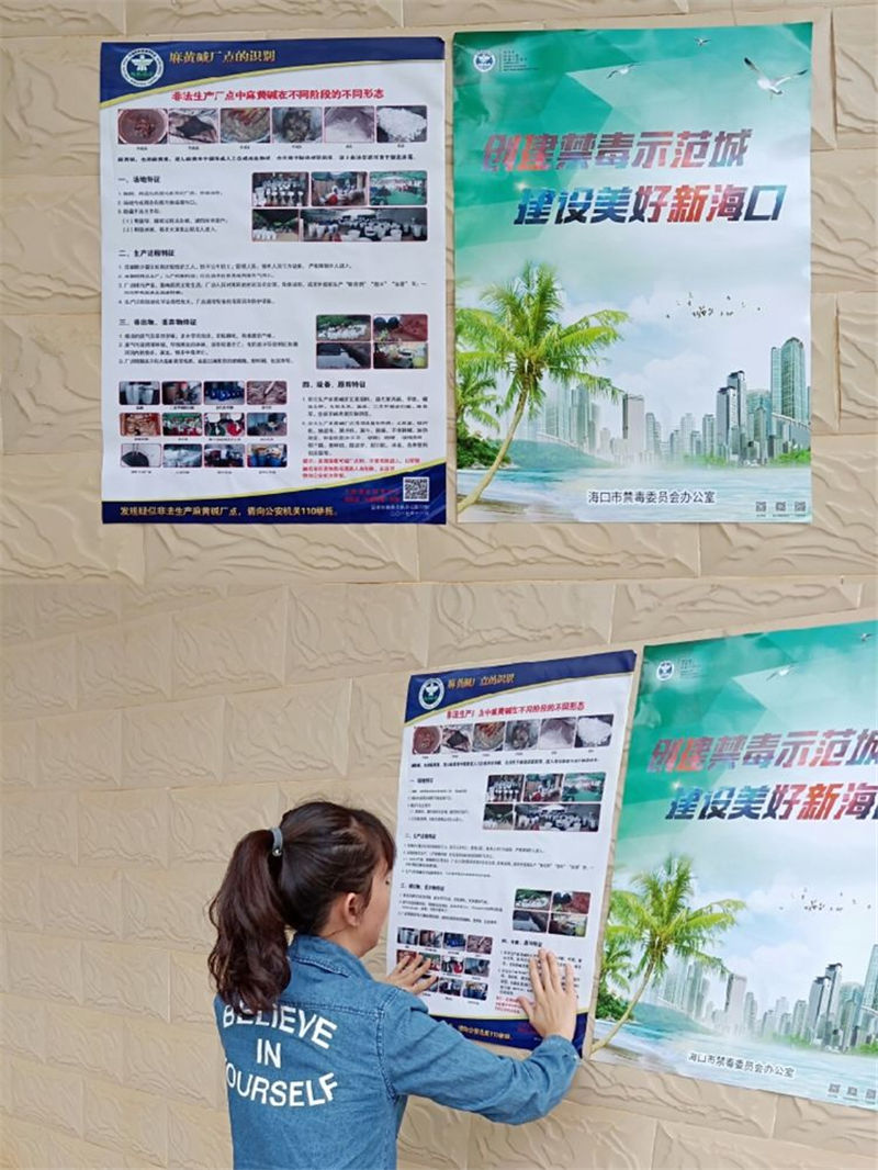 禁毒志愿者在企業(yè)門口粘貼創(chuàng)建全國禁毒示范城宣傳海報