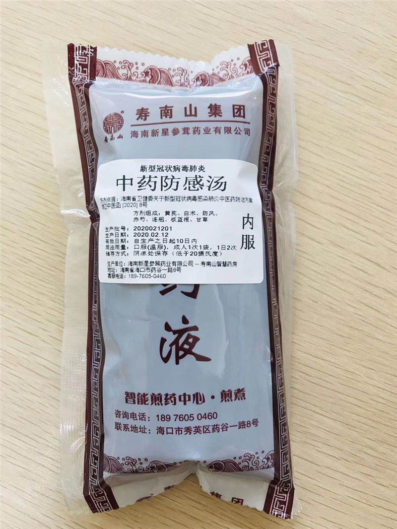 在當(dāng)前新型冠狀病毒感染肺炎疫情防控工作的關(guān)鍵時期,海南新星參茸藥業(yè)有限公司壽南山智慧藥房在壽南山集團(tuán)的統(tǒng)一安排下,積極落實各級黨委政府抗擊疫情的相關(guān)部署要求,深入踐行習(xí)總書記“生命重于泰山,疫情就是命令,防控就是責(zé)任”的指示,積極踐行社會責(zé)任,參與疫情防控工作。自2020126日以來,應(yīng)海南省中醫(yī)院委托,我司協(xié)助海南省中醫(yī)院集中代煎針對此次疫情防治的中藥防感湯劑(方劑出自海南省衛(wèi)生健康委員會關(guān)于印發(fā)《海南省新型冠狀病毒感染的肺炎中醫(yī)防治方案(試行)的通知》瓊衛(wèi)中醫(yī)函[2020] 8號,該防感湯劑主要提供給奮戰(zhàn)在一線的工作人員,為一線工作人員健康保駕護(hù)航。該中藥防感湯劑藥味不多,藥性平和,適合一般人群包括孕婦、小孩?诜栏袦梢蕴岣咦陨砻獾囊吡Γ鸬娇共《镜淖饔。